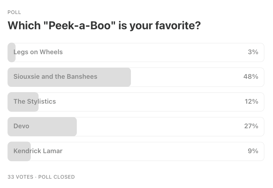 Since the poll only allows 5 entries, I’m going to include two polls to accommodate the 9 songs. Vote for just one entry in total. And if you prefer to share your choice in the comments, just let me know whether you voted in the poll. Or you can shoot me an email at earworm@substack.com.